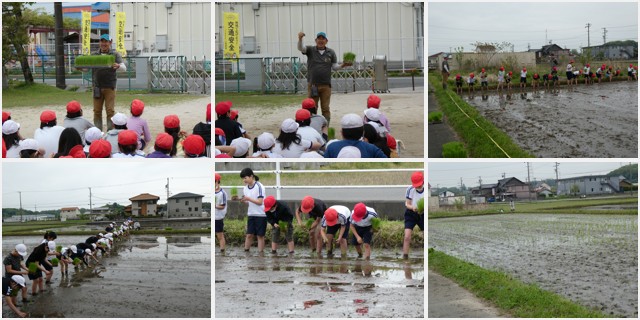 4月23日(火)、5年生は日沖さん、野呂さん、JAの方々や保護者の方にお世話になり、田植えの体験をしました。雨が心配な曇りのお天気でしたが、クラスごとの3列に分かれて、しっかりと植えていきました。初めて田んぼに足を踏み入れた子も多く、その感触にいろいろな感想を持ったようです。1株ずつ、腰をかがめて植えていく作業に、昔の米作りの大変さを知ることができると同時に、「楽しかった」と体験できたことを喜んでいる子どもたちもいました。2から4本ずつ植えた稲がこれから、どのように大きくなって、お米ができていくのか、本当に楽しみですね。貴重な体験をさせていただき、本当に感謝です。
