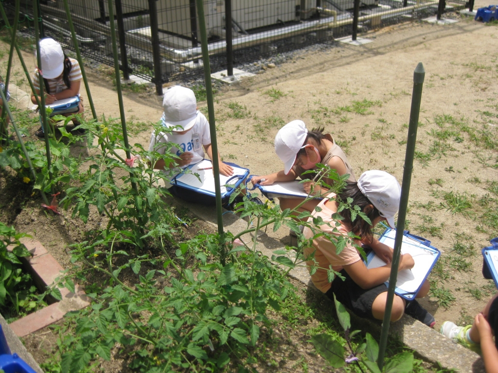 5月にトマト・ナス・ミニトマト・キュウリ・ピーマン・オクラを、中庭の畑に植えました。それから、日数がたち、ぐんぐんと大きくなっていきました。自分が観察したい野菜を決めて、育っている様子をワークシートにかいています。「野菜の赤ちゃんだね。」「葉っぱが、ザラザラしているよ。」「花の色は、黄色なんだね。」「大きさは、自分の手の2つ分だよ。」など、気づいたことが、たくさん出てきました。これから、どのように大きくなっていくのか楽しみです!!