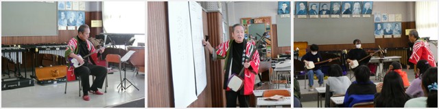 1月18日(木)に、5年生の1組と2組が、2月1日(木)に3組が、三味線の出前授業を行いました。山城町の坂さんにお越しいただき、三味線の演奏を聴かせていただいたり、三味線について教えていただいたり、三味線の弾き方を教えていただき、希望者の子たちが体験をしました。貴重な学びでした。