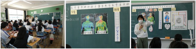 5月9日(木)、6年生は、栄養教諭の先生と食育の学習をしました。テーマは、「朝食の役割について考えよう」でした。朝食を食べないと体がどうなるかを考えた後、朝食の役割を5つ教えていただきました。どの役割もとても大切なものだと分かりました。忙しい朝ですが、赤、黄、緑の栄養のバランスを考えて、朝食をとることが大事だということを学びました。