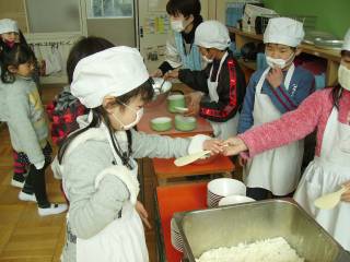 2月22日これは、1年生の給食の準備をしている写真です。 1年生は春から給食を食べ始めて、ぎこちないところもありますが、とても上手に配ることができるようになりました。 | |