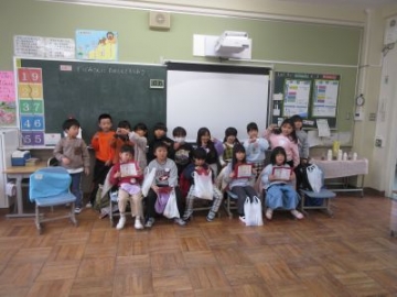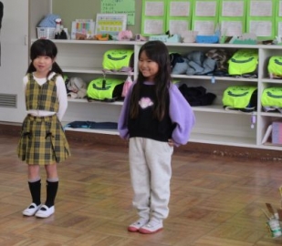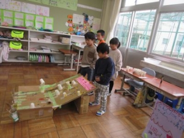 1年生が、水沢こども園のぞう組(年長)の皆さんを小学校に招待し、秋のおもちゃランドで楽しんでもらう活動を行いました。おもちゃランドには、どんぐりを使ってできる的あてゲームやくじ引き、コリントゲームなどがあります。はじめに代表の児童から挨拶をし、その後、各グループからおもちゃの説明をしました。説明するための原稿はありましたが、何も見ずに話す姿はさすがでした。「的あてゲームしませんか!」と声をかけたり、「こうやってやるんだよ」と優しくやり方を説明したりと、いつもとは違うお客さんに、とても丁寧に優しく接することができました。園の子どもたちも、はじめは緊張していたようでしたが、1年生の声かけに安心したようで、おもちゃランドを楽しむ様子が出てきました。相手を意識して活動することで、おもてなしの心など、さまざまな学びがあったようです。