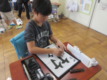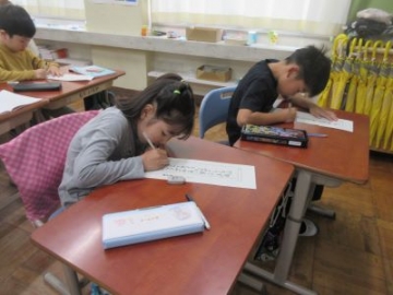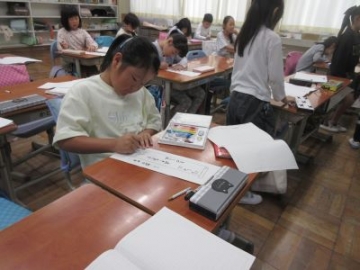 4年生の書写の時間です。子どもたちは、「竹笛」の清書を行っていました。字の中心を意識しながら、それぞれの漢字の字形に気をつけて、練習してきました。清書の時間は、どの子も集中して作品を書き上げています。鉛筆で書く字とは違い、4年生ともなると筆使いもしっかりと整ってきました。最後は、自分の一番よくできたと思う作品を提出。出来上がった作品は、教室の後ろの掲示板に掲示されます。みんなの作品が並ぶのが楽しみですね。