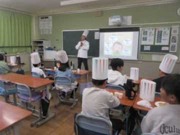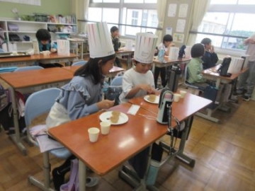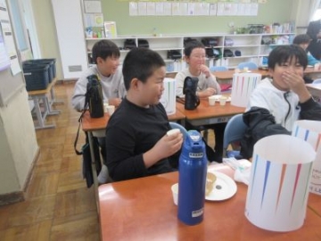 5年生で、「塩味」「酸味」「苦味」「甘味」「うま味」の5つの味について、食育アドバイザーの先生から学びました。はじめに五感(視覚、聴覚、嗅覚、触覚、味覚)とは何かを教えていただいた後、それぞれの「鼻をつまんでグレープ味のグミを食べる」「鼻をつままずにグミを食べる」を、実際にグミを食べてみるという体験を行いました。「何の味かわからない」「あっ、グレープの味がした!」と鼻をつまんで食べると味覚がしないことを実感していました。塩や酢、お出汁の味も確かめながら、いろいろな味をしっかりと感じていました。食べることや調理することの大切さを学ぶとともに食の楽しみ方を知ることができました。