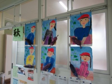 図画工作の時間に、生活科で行ったサツマイモ掘りの様子を描きました。大きな芋を一生懸命、掘っている様子がしっかりと伝わってくるよう、人物を中心に大きく表し、力強くサツマイモを掘る様子を表現しました。今にも声が聞こえてきそうな絵が、1年生の廊下に掲示されました。冬の足音が聞こえ始めてきましたが、秋の思い出として、子どもたちの作品が季節を感じさせてくれています。