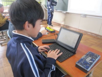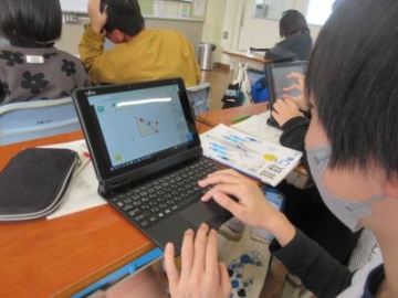 算数科で、三角形の面積の求め方を学習しました。ノートにめあてを書くと、机の上には、そのままノートを置いている子と、タブレット端末を準備する子がいました。よく見てみると、ノートに作図をしたり、デジタル教科書からデータの三角形を基にしながら考えたりと、子どもたちそれぞれが自分の考える手段を選択しながら、考えていました。考えを整理したりまとめたりするための自分なりの学び方を身に付けています。