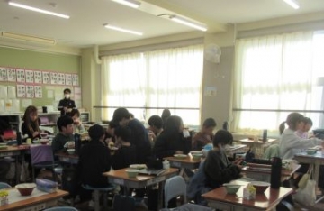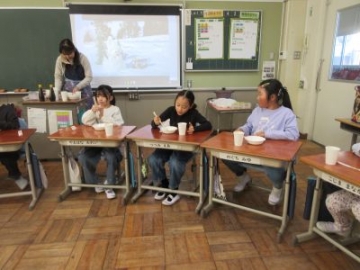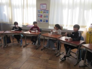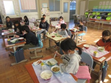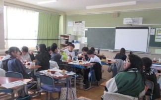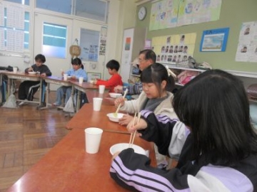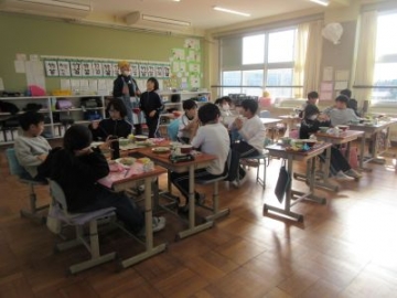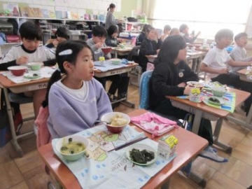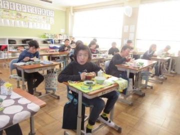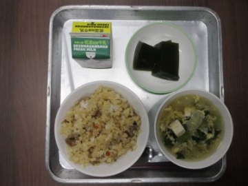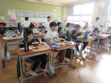 今日と明日は、「四日市ふるさと給食の日」です。今日の献立は、とり飯、牛乳、地物たっぷりかきたま汁、手作り伊勢茶ゼリーです。伊勢茶ゼリーは、水沢のお茶を使ったデザート、とり飯は水沢地区でもお祝いの時に食べることがある献立だそうです。地元の食材を使った給食。調理員の方々も、みんなにおいしく食べてもらおうと、一生懸命作ってくださいました。教室を回ると「とり飯、おいしい!おかわりしよ!」「残さず食べて、伊勢茶ゼリーもおかわりするぞ」と、おいしくいただいていました。