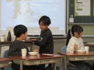 2年生が、学級園で育てた大根を使って、収穫祭をしました。先日、郵便局に年賀状を投函してきた後、みんなで大根を収穫しました。とても甘みのある大根で、子どもたちも「おいしい!」「おかわりほしい!」と、とてもおいしかったようで、口々に話していました。一緒に、学校支援ボランティアの方が育てた紫色のジャガイモもいただきました。自分たちで育てた野菜、そして、地域の方からいただいた野菜を味わいながら、収穫した喜びと地域の方の温かさを改めて感じた2年生の子どもたちでした。