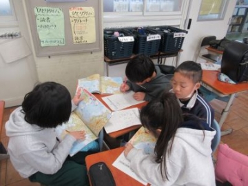 3年生が社会科の学習で、地図帳を使って、地名しりとりをしました。ペアやグループに分かれ、「熊野市(くまのし)」「渋谷区(しぶやく)」・・・など、地図帳を調べながら、地名の最後の文字で始まる地名を探していきます。お互いに問題を出し合いながら、夢中になって取り組んでいました。子どもたちも、楽しみながら地図の見方を覚えたり地名を知ったりすることができたようです。