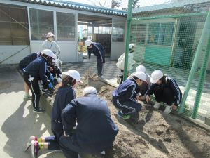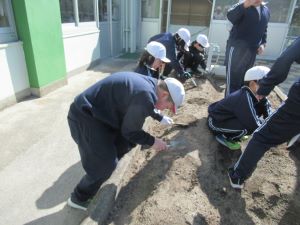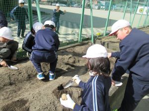 5年生が来年(6年生になったときに)担当する学級園に集まっていました。6年生の理科の学習で使用する予定のジャガイモを植えていました。今のうちから準備をしておくのですね。春からの学習が楽しみになったのではないでしょうか。