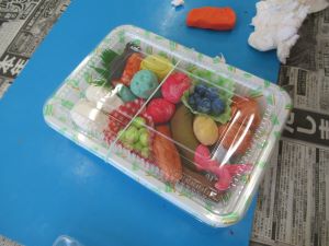 1年生は先週から図工の時間に紙粘土工作をしています。紙粘土に絵の具を混ぜて、色粘土を作りました。自分で考えた色とりどりのお弁当の具材に合わせて、色粘土を作っていました。おかずができるたびにおとなりさんと見せ合いっこをして、「上手だね。」「おいしそう。」と話していました。どのお弁当もとてもおいしそうにできていましたよ。