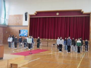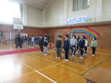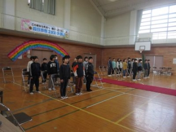 19日(木)の卒業式に向け、本格的に練習が始まりました。体育館の入口からは、子どもたちの緊張感のある空気が伝わってきます。今年は、4、5年生が在校生代表として卒業式に出席します。「起立」のアナウンスで、スッとその場に立ちます。立ち上がる時の椅子の音がするだけで、あとは静けさに包まれていました。担任から「卒業式は、卒業生にとって最後の授業です。そして、式を支える在校生代表が、次の高学年としてふさわしいかどうか、保護者の方や地域の方、先生方が見てくれています。」と、式典のねらいと大切にしたいことを事前に話したことで、子どもたちも今日の目標をしっかりと達成できました。6年生も、立ち方、座り方、歌や呼びかけなど、式の流れに合わせて練習を進めていきました。流れを一つ一つ確認しながらも、立つ姿勢や繰り返し行った起立や着席もしっかりできていました。最後には、「これから練習をがんばらないといけないです。」と今日の練習を振り返りました。
