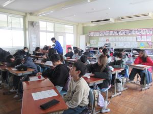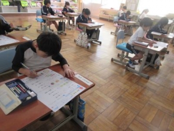 1年生が、算数のテストをしています。今まで学習してきたことを思い出しながら、問題に向かい合っていました。長さを比べる問題では、3本のリボンの長さを比べるために、マスの数を数え、それをテストの用紙にメモをとっておくなど、考えながら問題に取り組む姿から、一人で学ぶ方法をしっかり身に付けていることに感心しました。