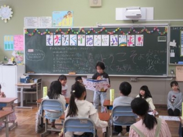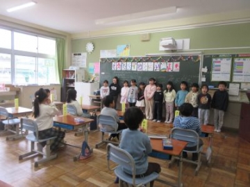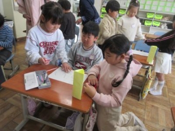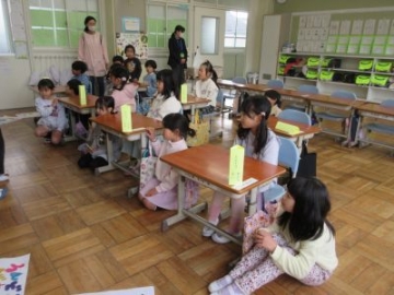 1年生が水沢こども園との交流会を行いました。今日で2回めです。年長の皆さんに、入学を前に、小学校のことを少しでも知ってもらおうというねらいです。1年生の子どもたちは、昇降口へのお迎えから、会の進行や発表も、自分たちで行いました。はじめに、小学校の1年間、行事や授業のこと、宿題のこと、チャイムがあることなど、経験してきたことを1枚1枚のカードで伝えていきました。とても詳しく、そして、わかりやすくまとめられていて、とても聞きやすかったです。次に、ランドセル体験、字を書く体験、校歌を聞いてもらうというプログラムです。1年生の子どもたちが、ミニ先生になって、とても丁寧に教えてくれていました。どれも、こども園の皆さんにとっては、新鮮なこと。はじめはドキドキしていた子たちも、いろいろなことが知れて、とてもうれしかったようです。最後には、サプライズで手紙を渡しました。堂々と司会をしたり発表したりしていましたが、「緊張したー」と、本音は1年生もドキドキしていたようでした。
