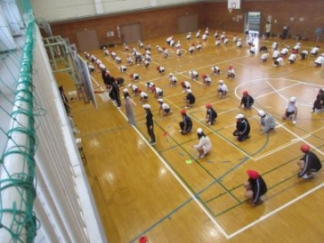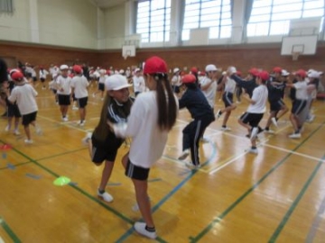 最後の全体練習は、体育館で行いました。運動会の開会式、準備体操(ラジオ体操)、全校ダンス、閉会式の順に練習を行いました。運動場とは違い、スペースも限られていますが、子どもたちはどの学年もきちんと整列し、練習に臨みました。運動会のスローガンは、「みんなで助け合って最後まであきらめずに最高の運動会にしよう」です。今日の練習では、話を聴く姿勢や体操やダンスをするときなど、メリハリをつけて動くことができました。本番は2日後です。スローガンにもあるように、「最後まで」自分の力を出し切っていきましょう!