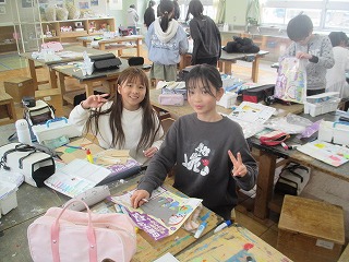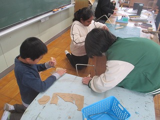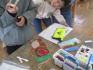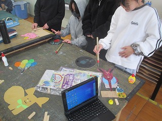 図工の時間に白板づくりをしています。板を電動のこぎりで切って形を整え、そこに色を付けていきます。だいぶ形ができてきて、完成に近づいている子もいました。おさるの絵を上手に描いている子もいました。写真を撮ろうと近づくと、こちらに向かってピースをしてくれている子もいました。