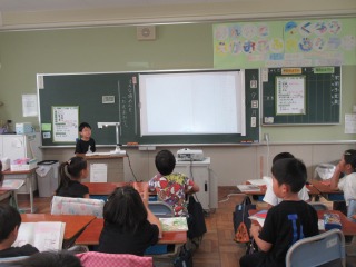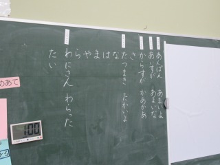 1年生は「あいうえおのうた」を自分で考えて作る授業をしていました。「ありのこ あちこち あいうえお」が「あいすが あまいよ あいうえお」「からすが かあかあ かきくけこ」「わにが わらった わ・・・を」といったように、いろいろと考えてリズムよく話していました。楽しみながら五十音を学び、言葉作りで語彙が増えていきますね。 2年生は「名前を見てちょうだい」のお話を読み、自分の 好きな場めんを伝え合うところでした。ノートに好きな場めんの言葉を抜き出して書いたり、絵に描いたりして紹介したいました。教科書のお話だけでなく、たくさんの本を読み、好きな本と出会ってほしいですね。  |