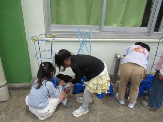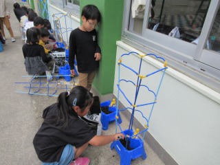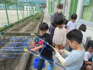 生活科の時間に「夏野菜の苗」を植えました。トマト、ミニトマト、キュウリ、ピーマン・・・いろいろな種類の苗を一人一鉢ずつ植えて育てます。1年生のときに「アサガオ」を育てた植木鉢に、新しく野菜の土を入れました。移植ごては二人に一つ。協力し合って土を入れたり、苗を植えたりしました。 苗を植え終わって、やさしく水やりをして、教室前の日当たりのよい犬走りに植木鉢を置きました。これから野菜が育つまでしっかりお世話をしましょう。