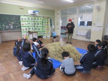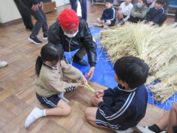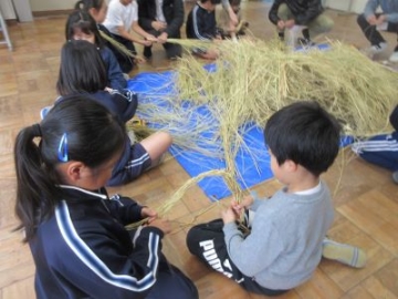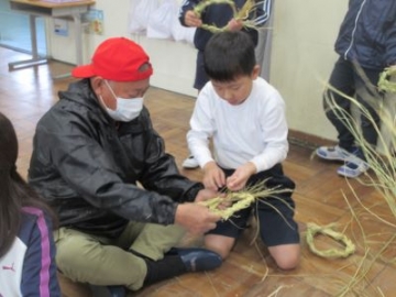 地域の学校支援ボランティアの方にお越しいただき、2年生がわらを使ったリースづくりを教えていただきました。このわらは、5年生が4月に種まきから始めたもち米です。わらを手に取り、三つ編みを編むようにして、編みこんでいきます。はじめは、三つ編みのできる子どもが中心となり、ペアで作っていきます。慣れてくると、だんだん編み込むスピードも速くなってきました。「こうやったら編めるよ」「上手にできた!」と、お互いに教え合いながら、リースが出来上がってきました。飾りつけをして、出来上がり。お米作りを通して、お米を食べるだけでなく、わらも使って暮らしを豊かにする環境への配慮も学びました。    |