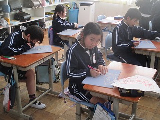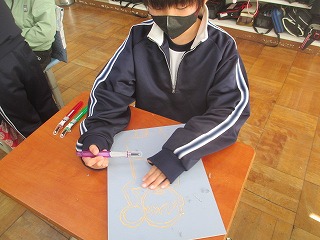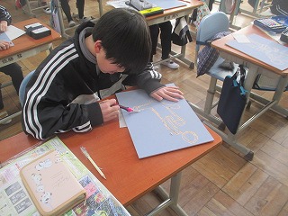 図工の時間に版画の板を彫刻刀で掘っていました。ボールを投げようとしている人物画やタブレットで調べてキャラクターを参考にして下絵を書き、本日は少しずつ板を掘り進めていました。まだまだ彫刻刀の扱いに慣れていないのか、彫刻刀の進む方向に手を置いて板を支えようとしている子がいたので、担当の先生から、手の置き方について注意を受けていました。