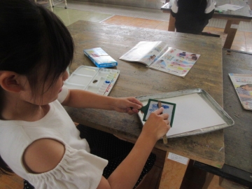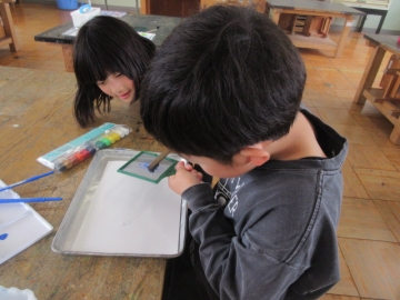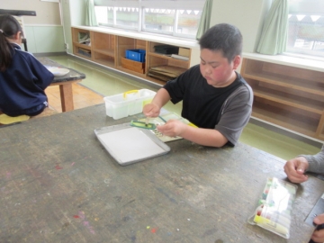 4年生が図画工作科の授業で、いろいろな塗り方の挑戦しました。筆を使わず、ブラシと網、段ボール、ストローを使って、画用紙に色をのせていきます。どんな作品が出来上がるか、楽しみですね。