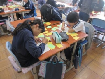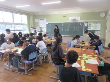 中学校の国語科の先生による乗り入れ授業がありました。授業のねらいは「文は単語が集まってできていることを知る」「単語の特徴を知り、文を書く時の目標を立てることができる」です。名詞などの自立語と助詞などの付属語のカードをつくり、それを並べながら文をつくっていきました。グループで話し合いをしながら、文をつくる楽しさを学ぶことができたようです。