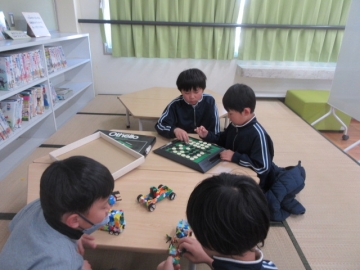 交流室は、いろいろな学年のなかまと交流することが目的の部屋。トランプやオセロ、LaQ(ラキュー)(7種類のパーツを組み合わせていろいろなものを作ることができるパズルブロック)を使って、楽しく過ごしていました。運動場での外遊びだけでなく、同学年、異学年問わずともに過ごすことができるなかまがいることは、とても素敵なことですね。