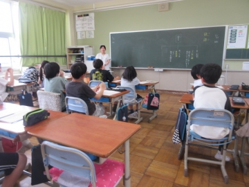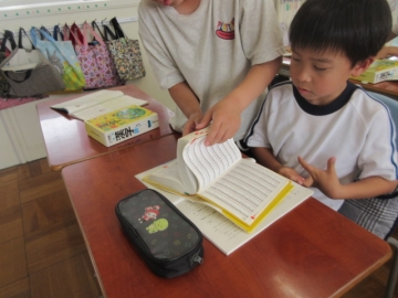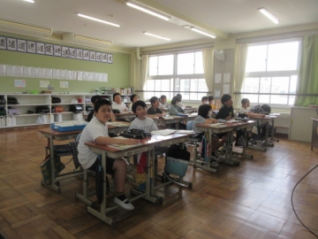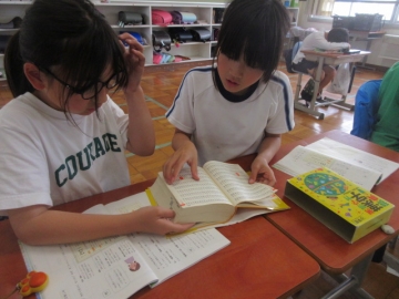 5年生では、敬語について学んでいました。「言う」にも相手や使う場面によってさまざまな言い方があります。「言います」「おっしゃる」「申す」それぞれ、相手や使う場面の例示とともに丁寧語、尊敬語、謙譲語の用語を覚えました。「あ、校長先生には尊敬語を使わないと」と早速、学習したことがつぶやきに出ていました。 4年生では、漢字辞典の使い方を学習しました。今日は「総画索引」を使った調べ方を学習します。まずは、「山」という字を探します。総画は3画なので、すぐに見つかりました。次は「陽」です。少し時間はかかりましたが、見つけることができました。    |