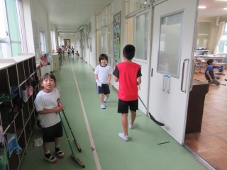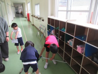 掃除の時間、1階の廊下で見かけた姿です。1年生も掃除道具の使い方は、しっかりと身についてきました。今日は、1年生が6年生から「隅々まできれいにするために、ほこりがたまりやすい場所と掃除の仕方」を教わりました。さすが6年生です。これまでの経験から、どんなところを掃除すれば学校がきれいになるのかをよく知っています。時間内に掃除を終わらせることが目的ではなく、「学校をきれいにする」ことを6年生が1年生のお手本となって教えてくれた一場面でした。