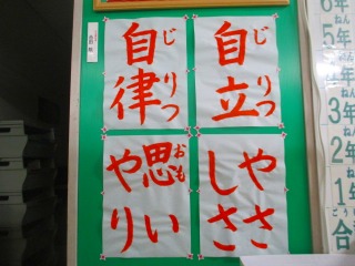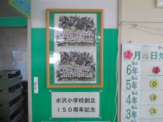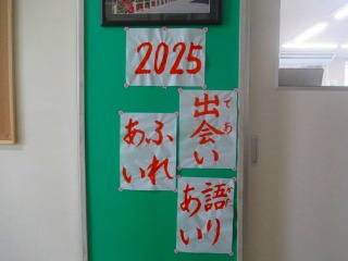 校長も子どもたちへの願いを込め、新年試筆をしてみました。「出会い、ふれあい、語り合い」は、非認知能力を育むためにも大切なことだと考えています。水沢小学校創立150周年記念の運動会の時に撮影した集合写真も、校長室の前の廊下に飾りました。2025年も子どもたちが心やさしく育ち、健康で元気に学校生活が送れますように。