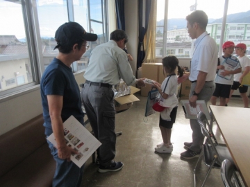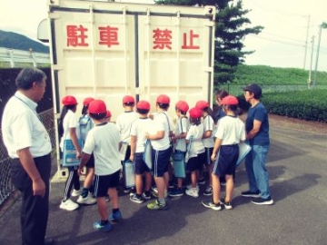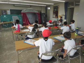 水沢地区防災会を通じて、水沢地区防災会の方、水沢地区市民センターの方、消防団の方にお世話になり、消防団の役割や消防車の見学、防災倉庫の中の見学などを行いました。子どもたちからは、消防団について「出動するときは何人くらいですか」「消火するまでにはどれくらいの時間がかかるのですか」など質問をしながら学んでいきました。また、普段、見ることができない防災倉庫の中を見学を通して、災害時に必要なものがたくさん入っていることに驚いていました。身近な施設で、それぞれの役割の方々がかかわってくださることで、自然災害から人びとを守ることにつながっていることを学んだようです。     |