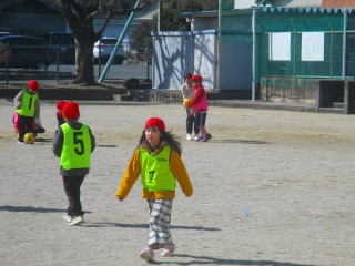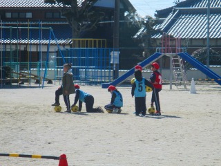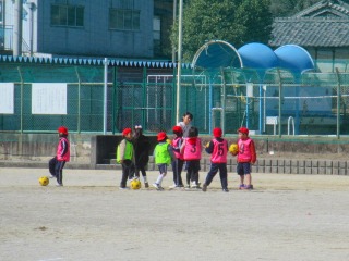 体育の授業にサッカーをしました。最初に運動場を走り、ボールの蹴り合いをしました。その後、シュート練習をし、ミニゴールを使って4チームに分かれ、サッカーゲームをしました。ドリブルのうまい子もいて、ディフェンスに来ている子をスイスイと抜き、ゴール前へとボールを運んでシュートしていました。