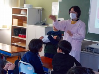 助産師さんから、「みんなが生まれた日~大切なみんなのいのち~」というテーマでお話しいただきました。お母さんのおなかの中で育った赤ちゃんが生まれてくる様子の写真をスライドで見たり、生まれたばかりの赤ちゃんと同じくらいの大きさの人形を抱っこしたりして、命を守る大切さを学びました。