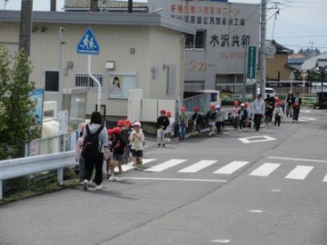 すいざわ学の時間に、1、2年生が本町公会所まで探検に出かけました。朝のうちに振っていた小雨も上がり、さあ出発です。2年生が先頭になり、歩き方も1年生のお手本です。歩くスピードも考えながら、上手に歩くことができました。公会所では、遊具で遊んだり鬼遊びをしたりと、思い思いに遊びました。先生の笛の合図が3回鳴ったら、それぞれの学年できちんと整列。楽しく遊ぶことももちろん、みんなで安全に学習するためのルールも学びました。まずは、学校の周辺から探検が始まりました。これから水沢にある素敵な場所をたくさん見つけていきましょう!     |