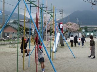 今日は朝休みからずっと運動場に子どもたちがたくさん出ています。昨年度までは「ボール遊びの日」と「おにごっこなどボールを使わない日」に分けて遊んでいましたが、今年度からは場所を分けて「ボールの場所」「おにごっこなどの場所」「遊具」とそれぞれが決まった場所で遊ぶことになりました。 おにごっこもサッカーも、遊具遊びも1年生から6年生までが混ざって遊んでいます。1年生はシーソーやすべり台が人気のようで、6年生が手を引いて連れていく姿がありました。 教室でお絵かきをする1年生のところにも6年生の子が来てくれて、「上手にかけているね。」とやさしく声をかけてくれていました。授業だけでなく休み時間も楽しく過ごせるとよいですね。