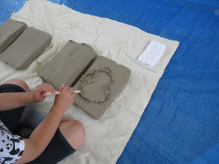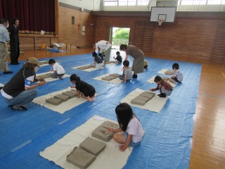 3時間目に、1年生の「陶芸ワークショップ」がありました。水沢小学校創立150周年記念事業の1つで、校庭の「水小花壇」を子どもたちの陶芸作品で飾るプロジェクトがあります。2年生以上の子どもたちは昨年度に実施しました。 瀬戸市から陶芸家の先生お二人に来ていただき、1時間教えていただき制作しました。陶芸家の先生方は「この遊びは・・」「土での遊びは・・」と話されます。難しいことを考えずに、自分の感覚で思いつくまま「土と遊ぶ」すてきな時間を過ごすことができました。全学年の作品を窯で焼き、形を合わせて、「水小花壇」に敷き詰める予定です。 足で踏んだり、手でこねたり、割り箸を使って絵を描いたり、1年生のみんなが楽しんで作っていることが伝わってきました。