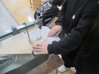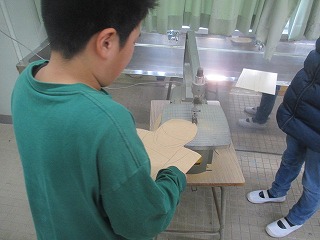 5年生は、図工の時間に糸のこぎりを使って、薄い板を切っていました。鉛筆でキャラクターを描いたり、花を描いたりしたものを線に沿って、切っていました。糸のこぎりが3台しかないので、上手に順番を譲り合っていました。曲線に切ったり、鋭い角度で切り込んだり、直角に切ったり、手さばきがなかなか難しかったようです。