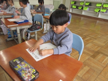 国語科の時間に「伝えあうために必要なことを選ぶ」学習をしました。自分の名前や好きなものなど、子どもたちが自己紹介を通して、どんなことを伝えるのか、話し合いました。その後は、お話する相手に渡す「名刺」づくりです。自分の名前を書き、イラストや色を付けてオリジナル名刺を作成しました。次は、名刺を交換しながら自分の名前や好きなものなどを相手に伝えます。子どもたちも「早く自己紹介がしたい。」と待ち遠しい様子でした。