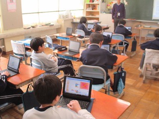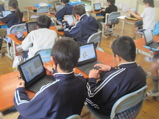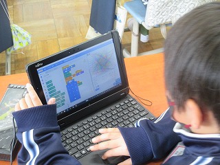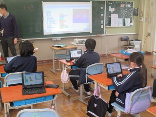 ICTサポート支援員の方に、プログラミングの授業をしていただきました。「プログラミングアート」をテーマに、Scratch3を使ってさまざまな模様を描いていました。「プログラミング(論理的思考)は左脳、アート(ひらめき)は右脳、右脳も左脳もどちらも使ってできるといいね」とお話していただき、子どもたちは、「角度をこうしてみよう!」「おもしろい模様ができた!」など、まさに右脳も左脳もフル回転で、プログラミングアートに取り組んでいました。