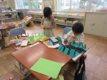 図画工作科の時間に、自分のイメージした景色や町の様子などを、画用紙を使って作品にしていきました。画用紙を折って立たせることで、立体感を出していきます。折り目をつけてうまく立たせることができるよう、何度も試しながら作品作りに集中していました。どんな作品に仕上がったかな。