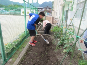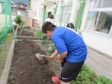 なかよし学級の子どもたちの様子です。学級園にモロヘイヤの苗を植えるため、畝を作りました。鍬を使って畝になるよう土を盛っていきます。道具の使い方がとても上手で、自然と畝が出来上がっていきました。「もう土はこれくらいでいいかな」と言いながら、苗を植えました。