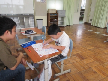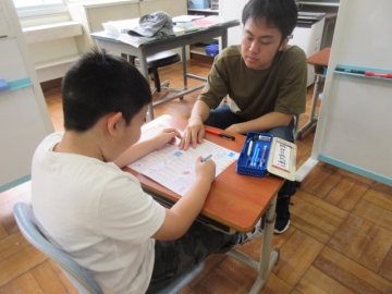 ローマ字の学習の様子です。学習ノートを使って、習ってきたローマ字を書き取ります。「発音しながら書いてみよう」「なぞるときははみ出さないように」など、先生のお話をしっかり聞きながら丁寧に取り組むことができました。