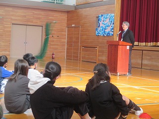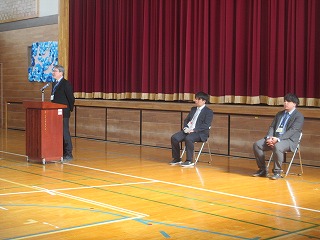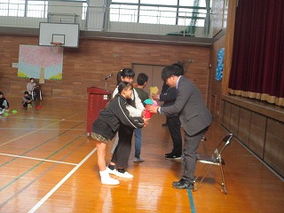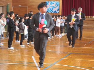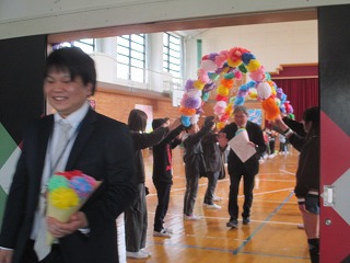 退任式、離任式では、本校を去られる3名の方から、順番に一言ずつあいさつをしていただきました。その後、子どもたちから手作りの花束が贈呈され、花道を作ってお別れをしました。