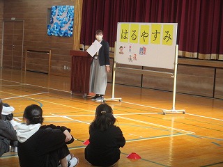 本日1限目に、修了式・離任式を行いました。全校児童が体育館に集まっての全校集会を行いました。修了式では、校歌を歌った後、校長から各学年の1年間の活動を振り返って話をしました。「上級生が下級生の面倒をしっかりと見てくれたこと」「なかまと笑顔で穏やかに接することができたこと」「しっかりとあいさつができるようになったこと」などについて話しました。生徒指導担当からは春休みの生活について話がありました。「早寝・早起き・朝ごはん」「ルールを守る」「やってみよう(チャレンジしよう)」「進んでお手伝いをする」「みんなで元気に会おう(新学期)」の話が「はるやすみ」にかけてありました。3つについて交通安全に気を付けることの話がありました。