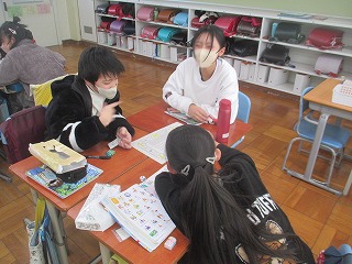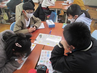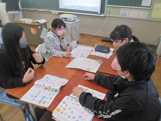 ○○○○.」と答える学習で、サイコロを回し、すごろくのように止まったところの言葉を入れて会話をしていました。ゲーム形式だったので、グループで楽しそうに学習を進めていました。