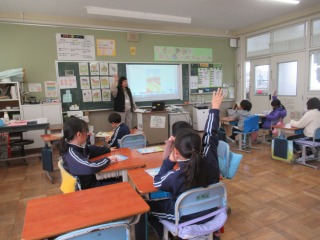 今日は外国語活動の日。HEF(外国語指導員)のアーリン先生と一緒に学習する日です。「Who are you?あなたはだあれ?」の学習で、動物の名前や鳴き声がたくさん出てくるストーリーを聴いて、どんな内容だったかを近くの子と話しました。普段から動物の名前を英語で言っていることもありますね。