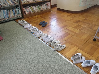 カーペットに上がるときには、上靴をきちんと揃えます。みんなが気持ちよく使えるように、よく考えて行動することができました。