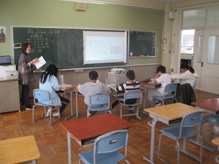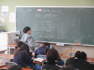 5年生は算数の時間に百分率の学習をしています。「もとにする量を100とみたとき、比べられる量がどれだけにあたるか」を考えていますが、なかなか内容は、難しいです。教室に結構子どもがいなかったので、私が「今日は休みが多いんだねぇ」と言ったら、「隣で別れて勉強しているよ」と子どもが教えてくれました。少人数で学習する時間でした。市内では、インフルエンザが流行っているので、「水沢小にもいよいよ来たかぁ」と思っていたら、欠席が少なく、みんな元気いっぱいでした。