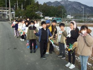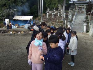 昨日、2年生の児童が地域の先生から教わって作った「しめ縄」を外しました。外した「しめ縄」を、校区探検でも訪れたことがある「足見田神社」に届けに行きました。昨夜は水沢地区に雪が降り、今朝も茶畑が白くなっているくらいの寒い日でしたが、子どもたちと先生は元気に出かけて行きました。神社では「どんど焼き」の準備をしている地域の方ともお話することができ、2年生の手作りしめ縄も1月12日(月)に焼いてもらえることになりました。5年生が4月に種まきをしたことから始まった「米づくり」の学習が他学年にも広がり、つながっています。