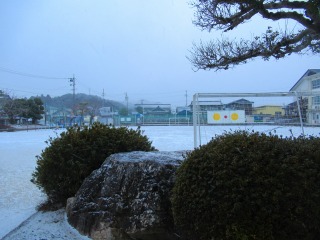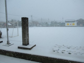 今日は久しぶりに運動場に雪が積もりました。朝から冷たい風が強く吹き、みるみるうちに真っ白になりました。日が当たると雪が止み、日がかげると吹雪くの繰り返しでした。雪に対応する服や靴ではない子が多く、雪も降り続いていたので、外遊びはしませんでした。子どもたちは寒い中でも「外で遊びたいなあ。」と言っていました。